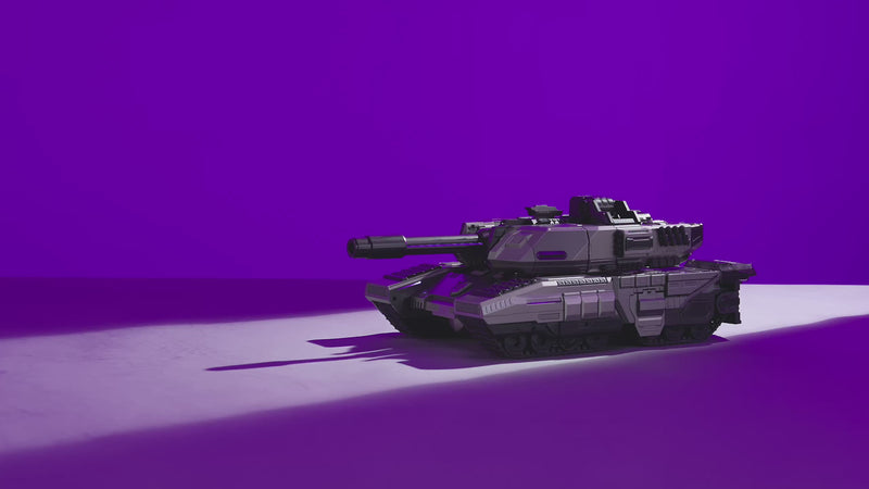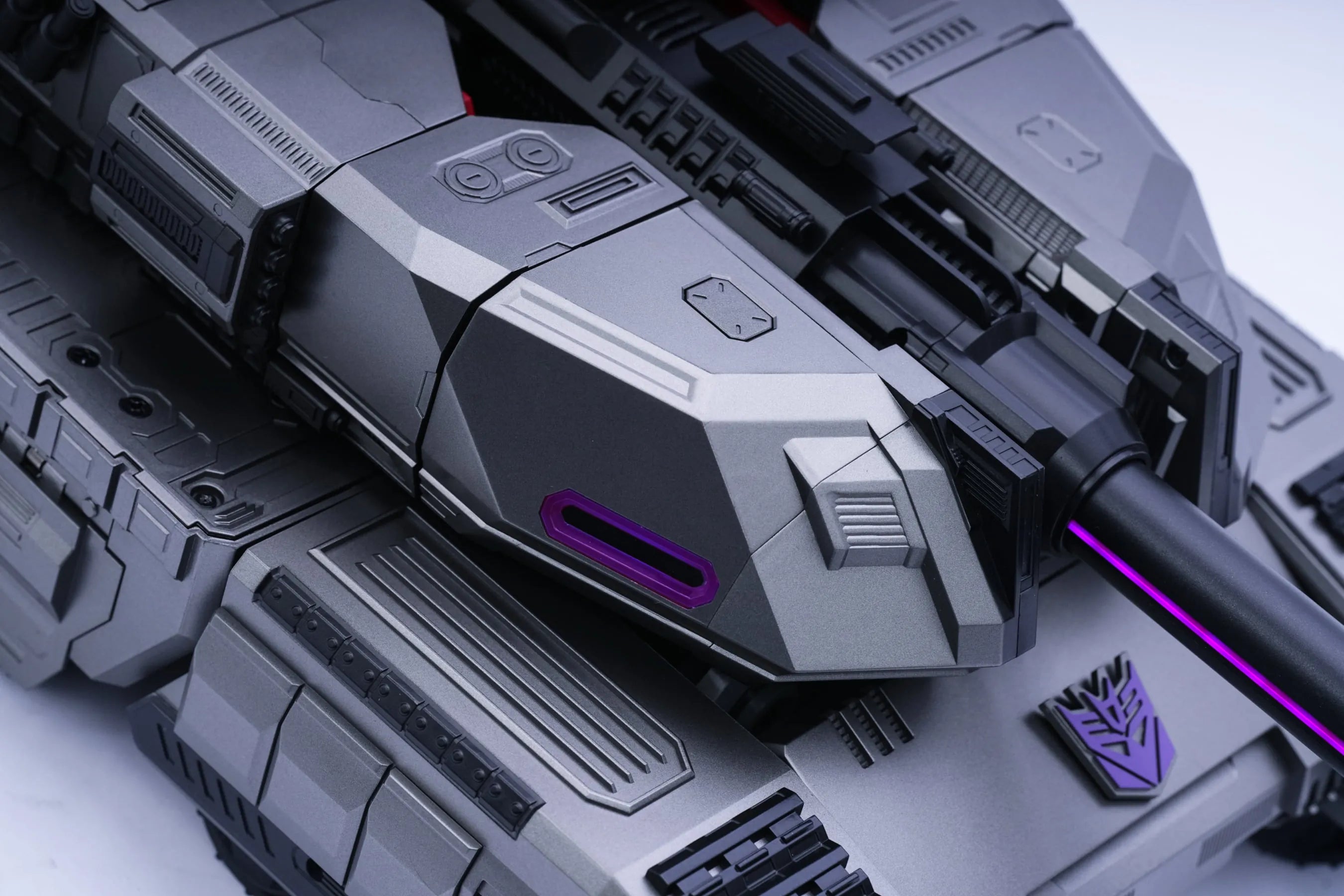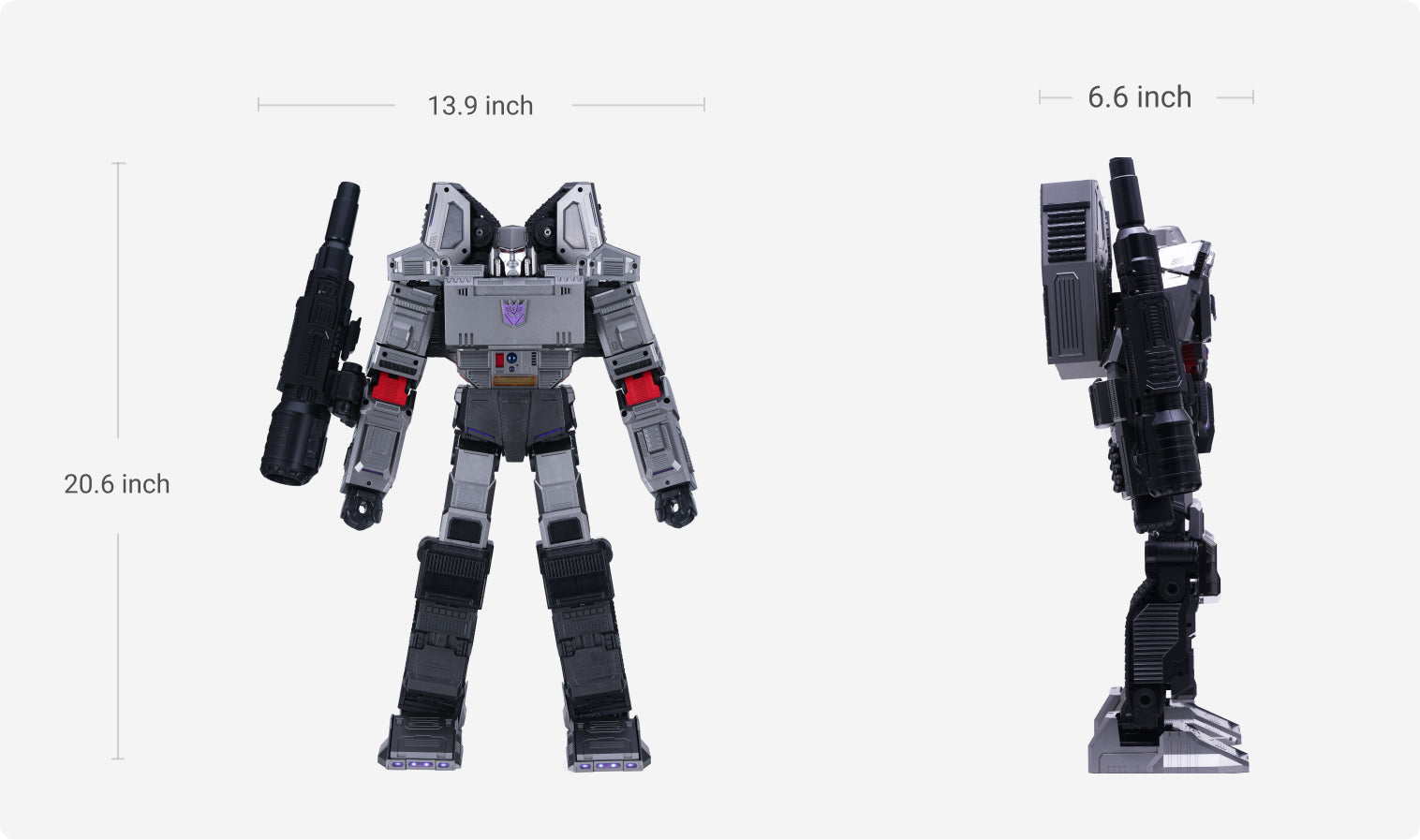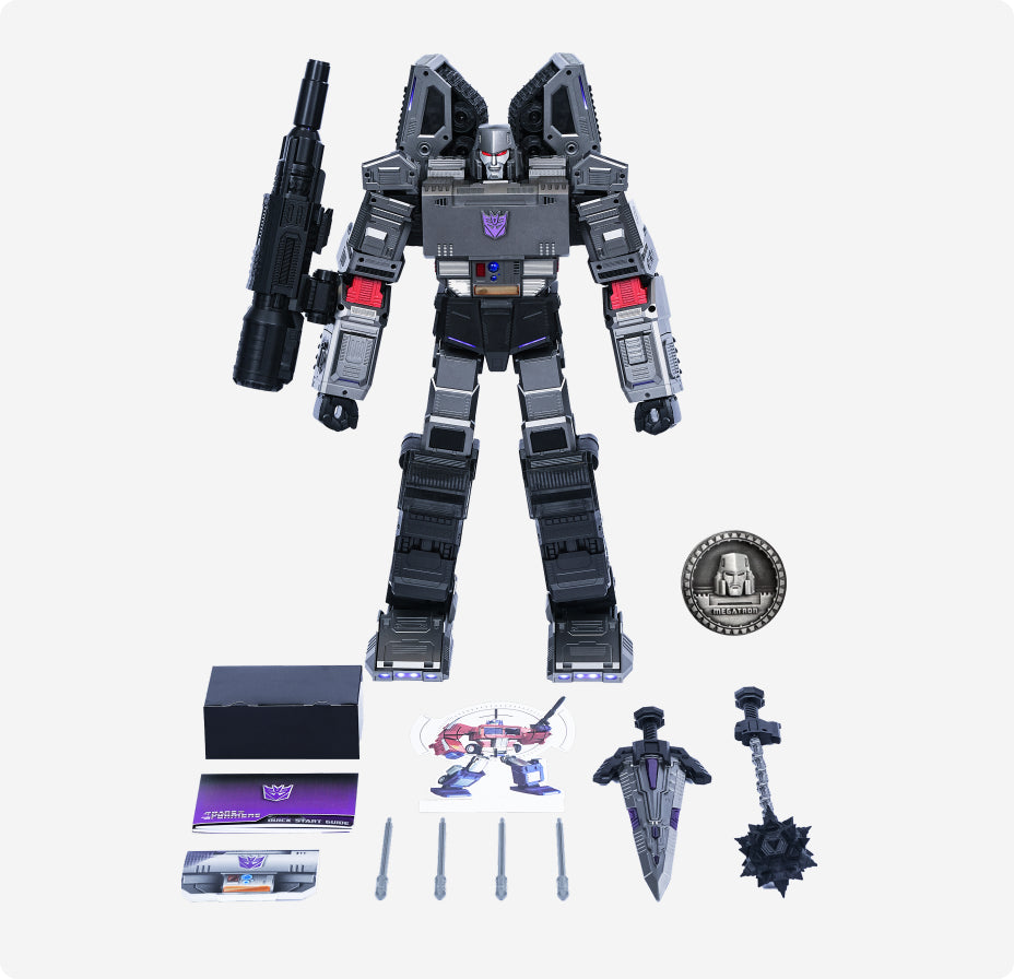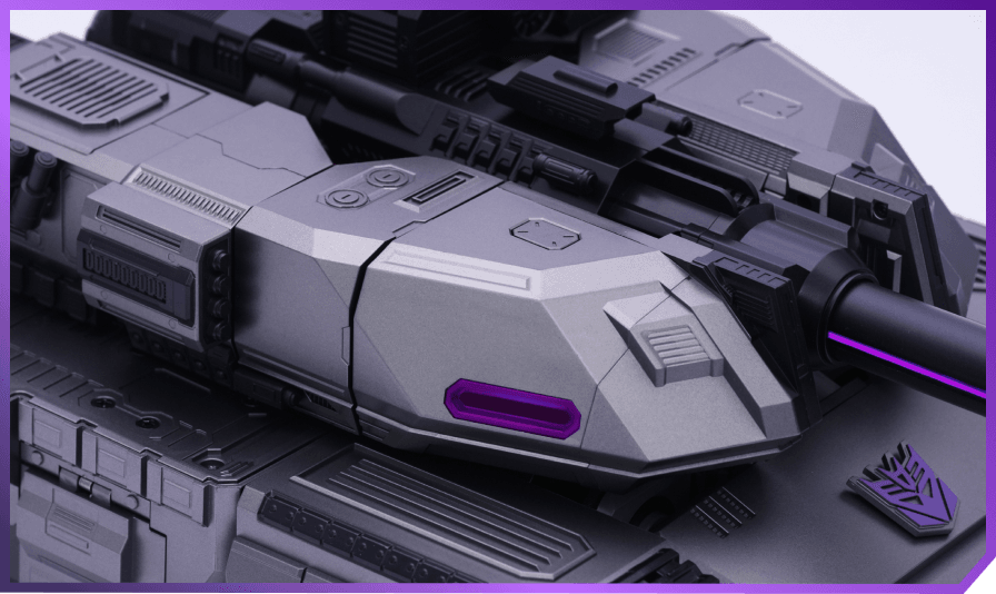 Die speziell entwickelte Legierung in einem tief silbergrauen Farbtonbringt den rücksichtslosen Charakter und die bedrohliche Natur desDecepticon Anführers optimal zur Geltung.